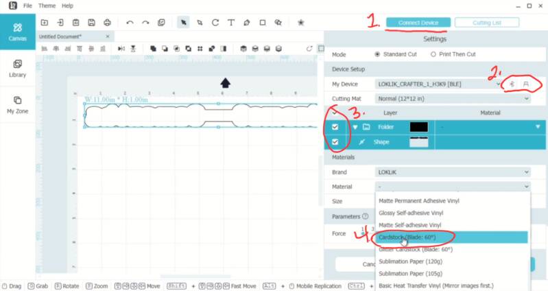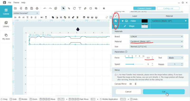 Go up to the right and select Connect Device. Connect your Loklik machine to your computer via Bluetooth or USB by clicking one of the corresponding icons. Once you're connected, check the boxes to select the Layer, Folder, and Shape that you'll be cutting. You hid the text, so all 3 boxes should be checked. For Materials section, leave the brand as Loklik, but for the material select Cardstock (60°). Up the Force to 5.0. Click on the Cut button.