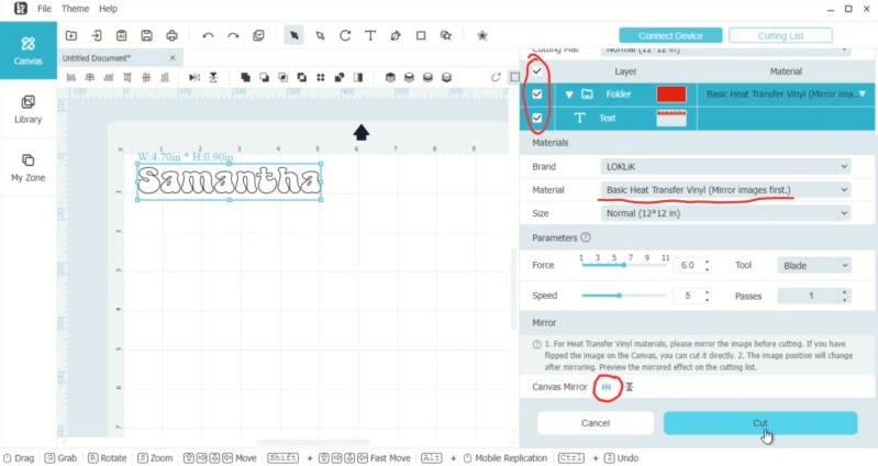In the Loklik IdeaStudio, click Connect Device. Check the Layer box which will automatically check the Folder and Text boxes, which will be the element you're cutting. Set the material to Basic Heat Transfer Vinyl, and click the first option on the Canvas Mirror line. This is going to mirror the image horizontally. Click Cut.