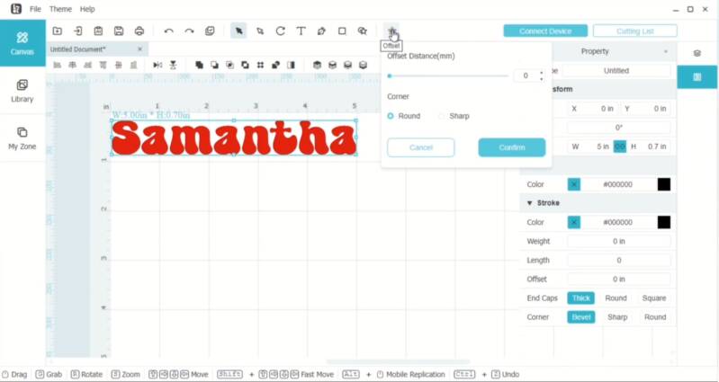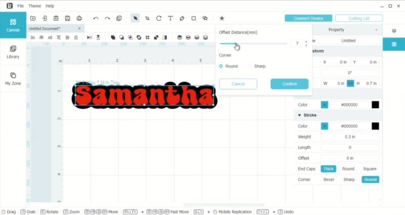 Next, select your text and drag the corner with your cursor to make the text about 5 inches long, or a good enough size that you can put an offset on it. You can adjust it to proper size once you have the offset. With the text still selected, go up to the Offset tool, which is represented by a black star with an outline around it. Adjust the Offset Distance to a size that leaves no holes in your offset or text. You don't want to make it too big, just big enough to get rid off any holes that may appear as you adjust the offset.