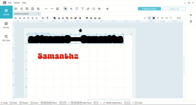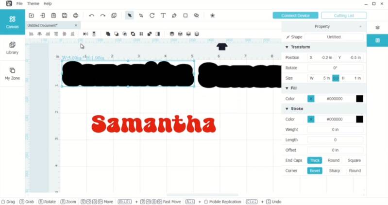 Once you have your offset how you want it, click on a blank area on the canvas to reset the cursor. Then, click and hold a blank area on the canvas near the text and offset. Drag over both elements so as to select them together. This will allow you drag the corner and adjust the element to the desired size. The mat is 12 inches. You're going to need to make the leather double the length of the offset. You're also going to have to add a one-inch tab between the two offsets. So, try to keep it no longer than 5 inches.