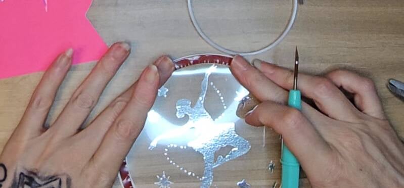 Apply the rose gold vinyl ballerina so she sits partially on the glitter cardstock and partially on the acetate window. To make it easier to align, place your transfer tape with the design partially onto the vinyl backing sheet, align, then slowly peel the backing sheet away as you press the vinyl onto the panel. Burnish and remove the transfer tape.