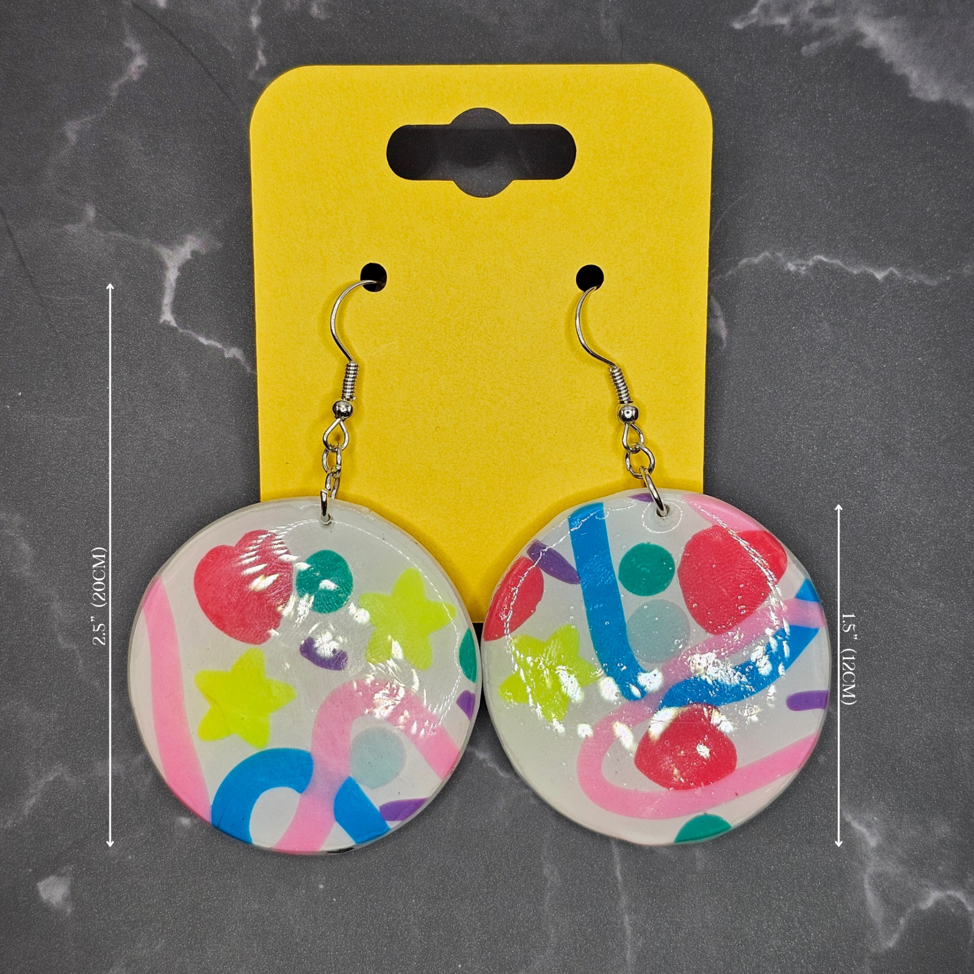 These 1980s inspired confetti earrings are made of polymer clay, UV resin, silvery hypoallergenic earring findings, and lots of love! These earrings also glow under UV/blacklight! So, perfect accessory for your next '80s rave.