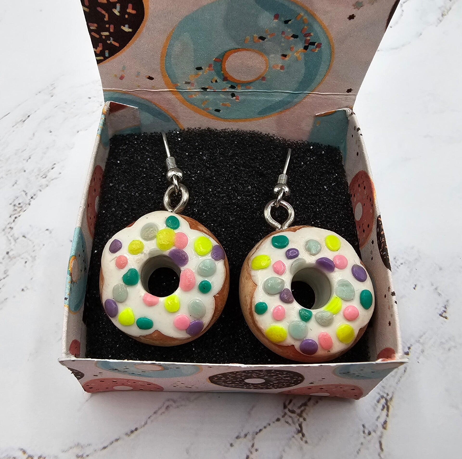 Love donuts? Then you'll love these earrings! Handmade, by Sam, with polymer clay and hypoallergenic earring findings, these cute earrings are one of a kind! Some sprinkles even glow brightly under UV/black light. They come in a handmade "Donut Box" that was also crafted by Sam with just as much love as she put into the earrings.