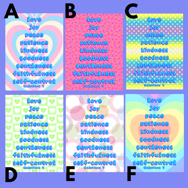 Celebrate spiritual growth with this pastel-colored heart print inspired by Galatians 5:22–23. Designed with concentric layers of soft blue, pink, and sunshine yellow, this vibrant artwork showcases the nine fruits of the Spirit: love, joy, peace, patience, kindness, goodness, gentleness, faithfulness, and self-control. Each virtue is thoughtfully placed to radiate from the heart’s center, creating a beautiful ripple of godly character and Christlike living.
